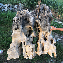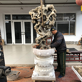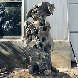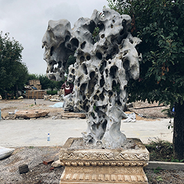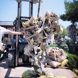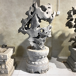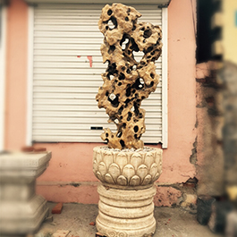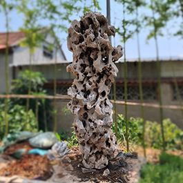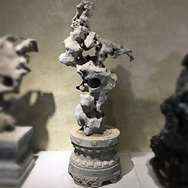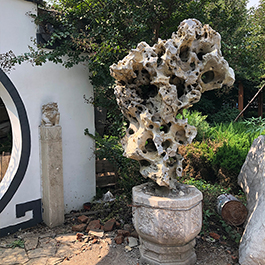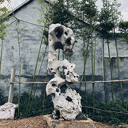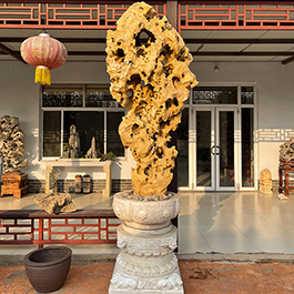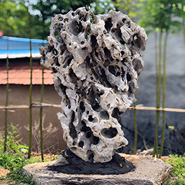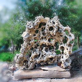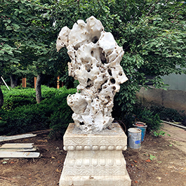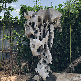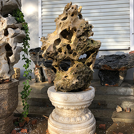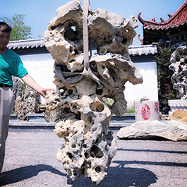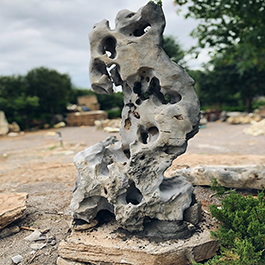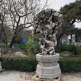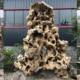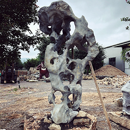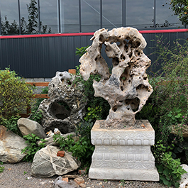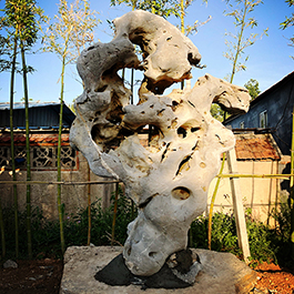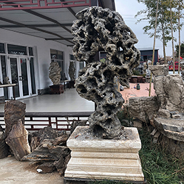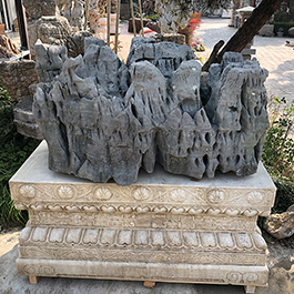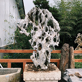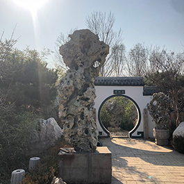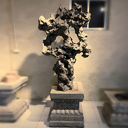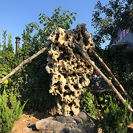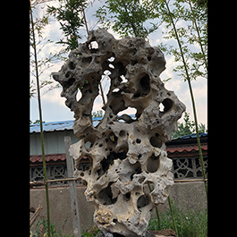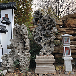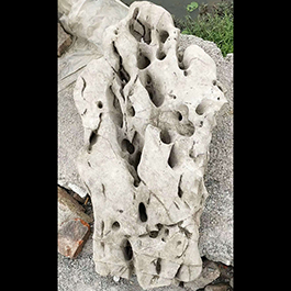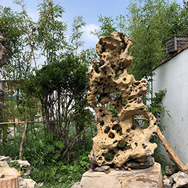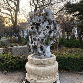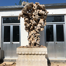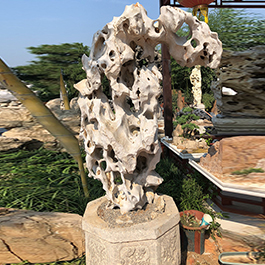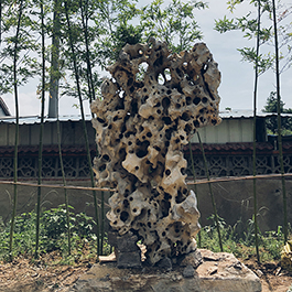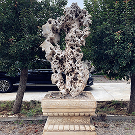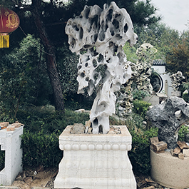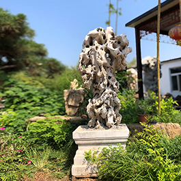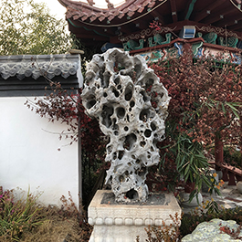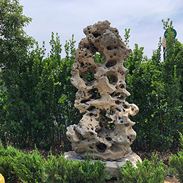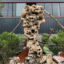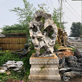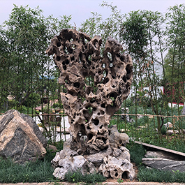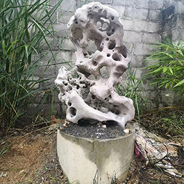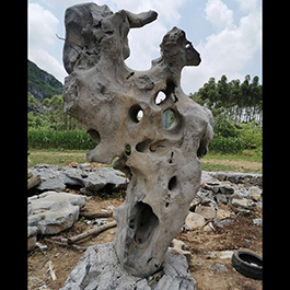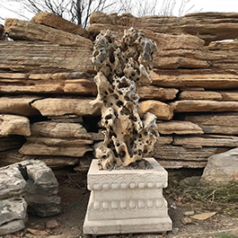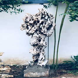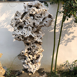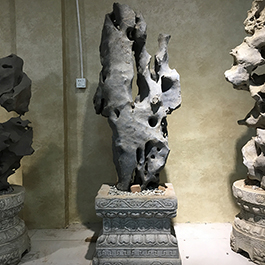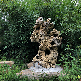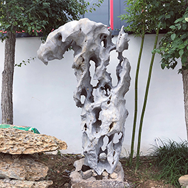 园林观赏石 各自独立 ,近前一峰为照,后有山谷一横,上有环抱 飞流而下,背有三峰高耸,其一 突兀直指,如刀如剑,大有“刺破青天”的感觉,主峰端庄凝重,典型的“靠山”也。